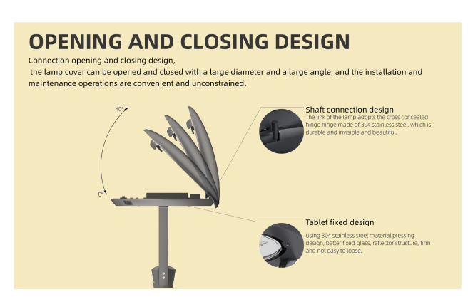 Ühenduse avamise ja sulgemise disain, lambi katet saab avada ja sulgeda suure nurga all,