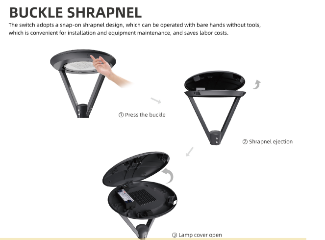 Kõrgsurvevalualumiiniumist lambikorpus, LED-aiavalgusti korpus, tugev konstruktsioon, hea löögikindlus.